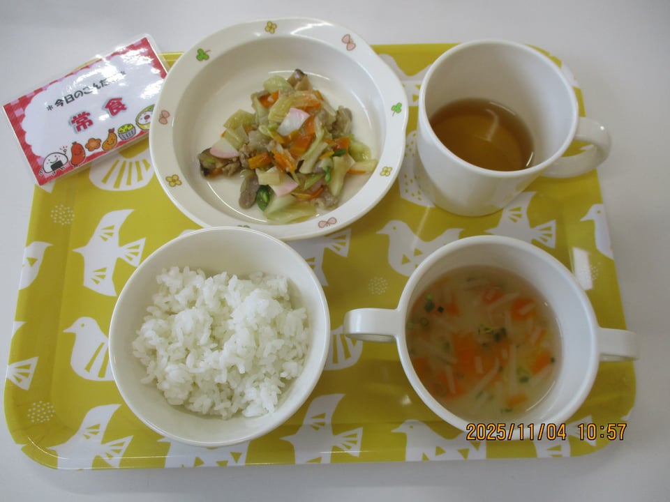 ・ごはん ・八宝菜 ・もやしと人参の中華スープ