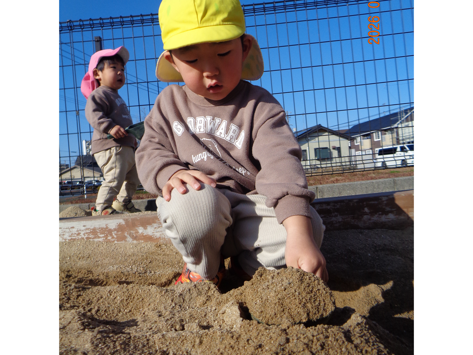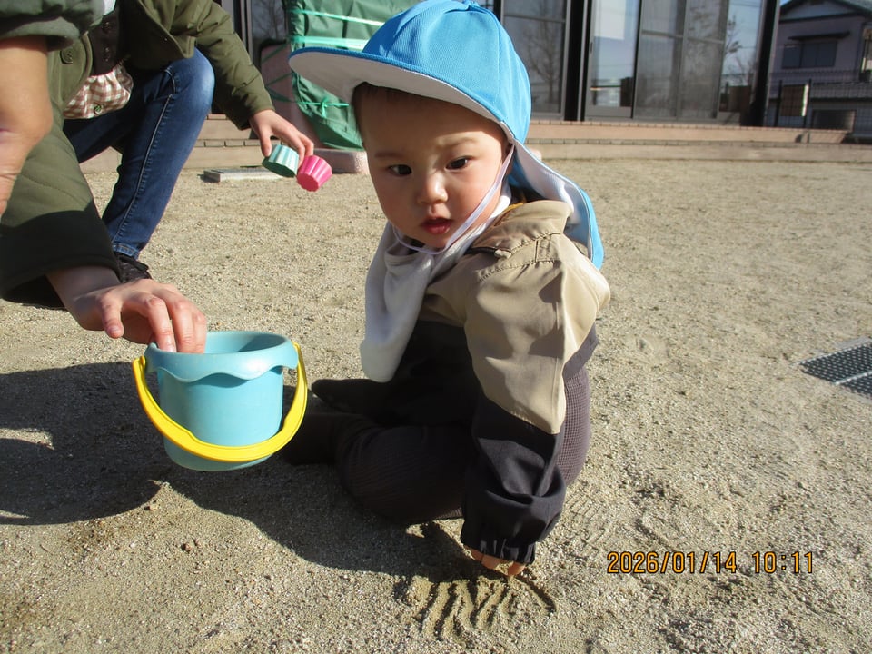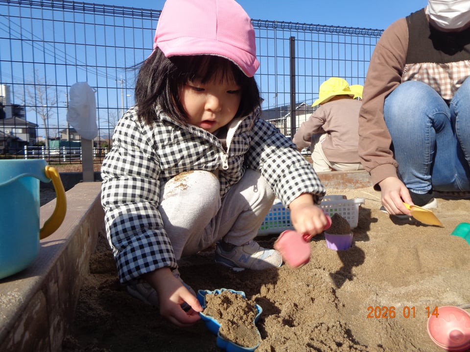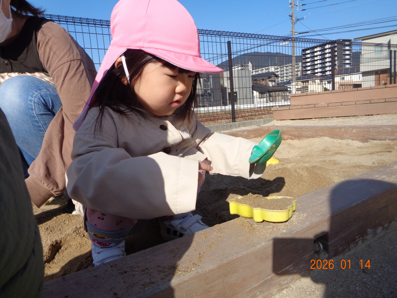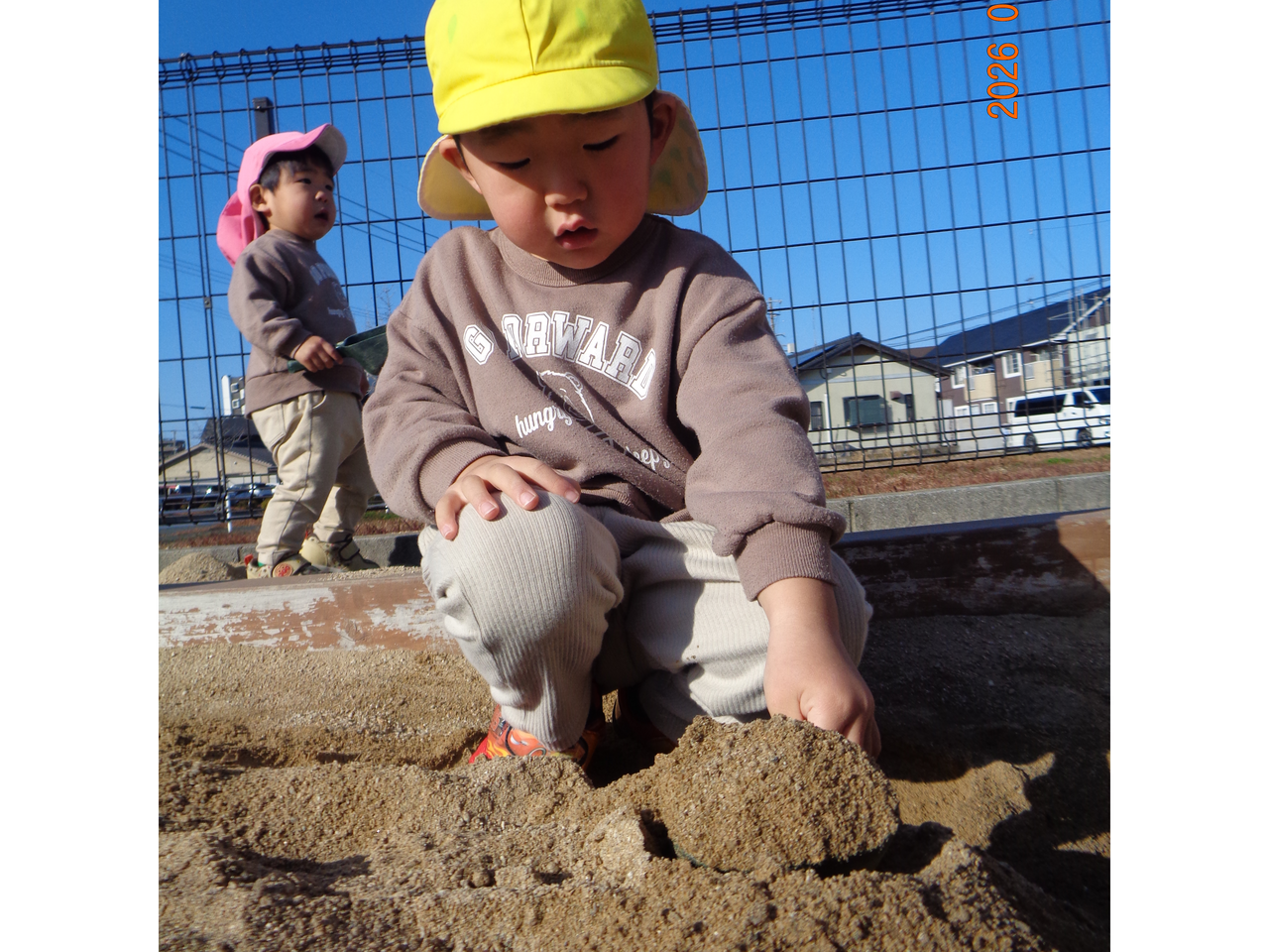 型はめを楽しむ姿やお砂で色々なものを作って遊びました(*^^*)