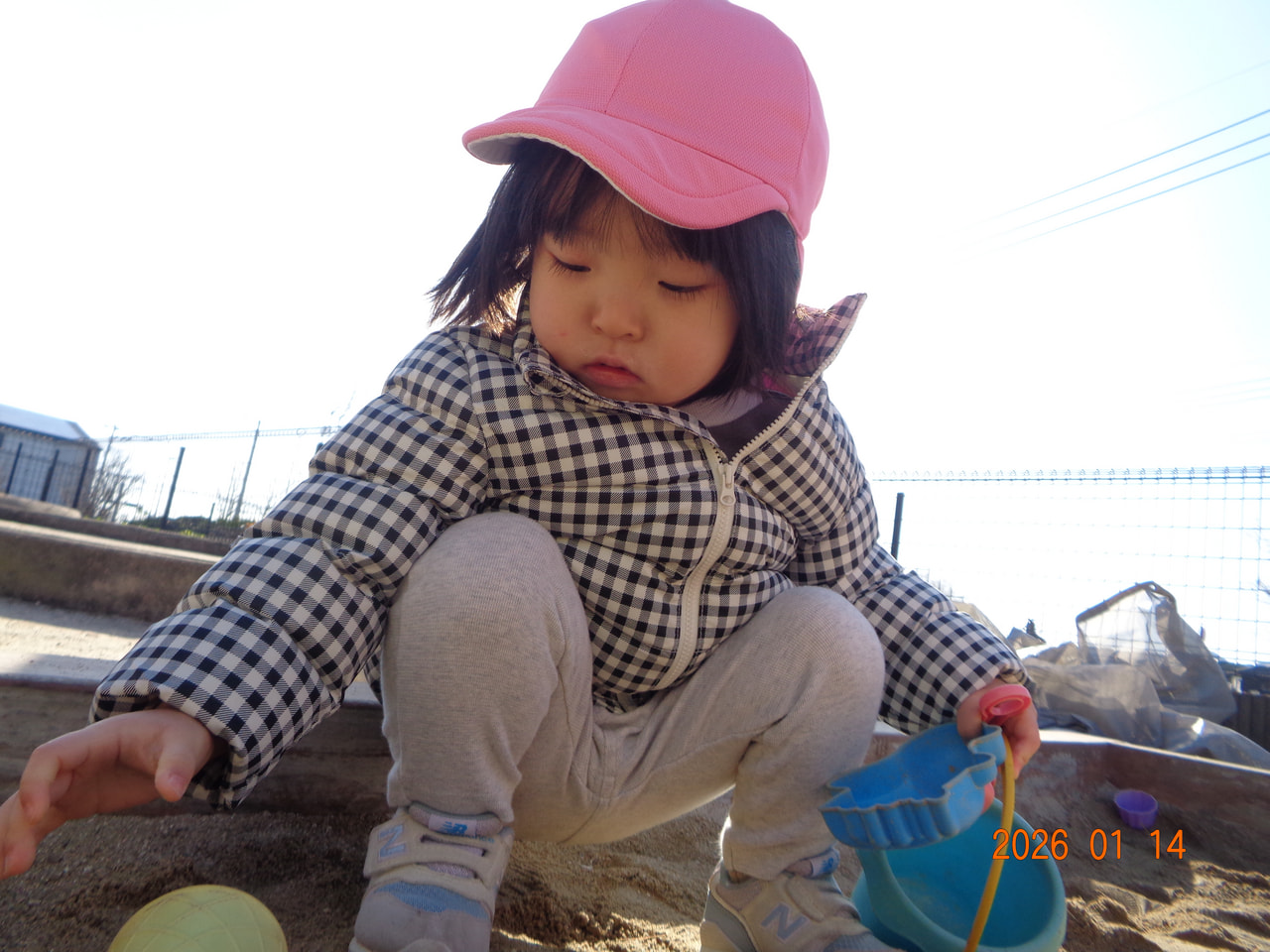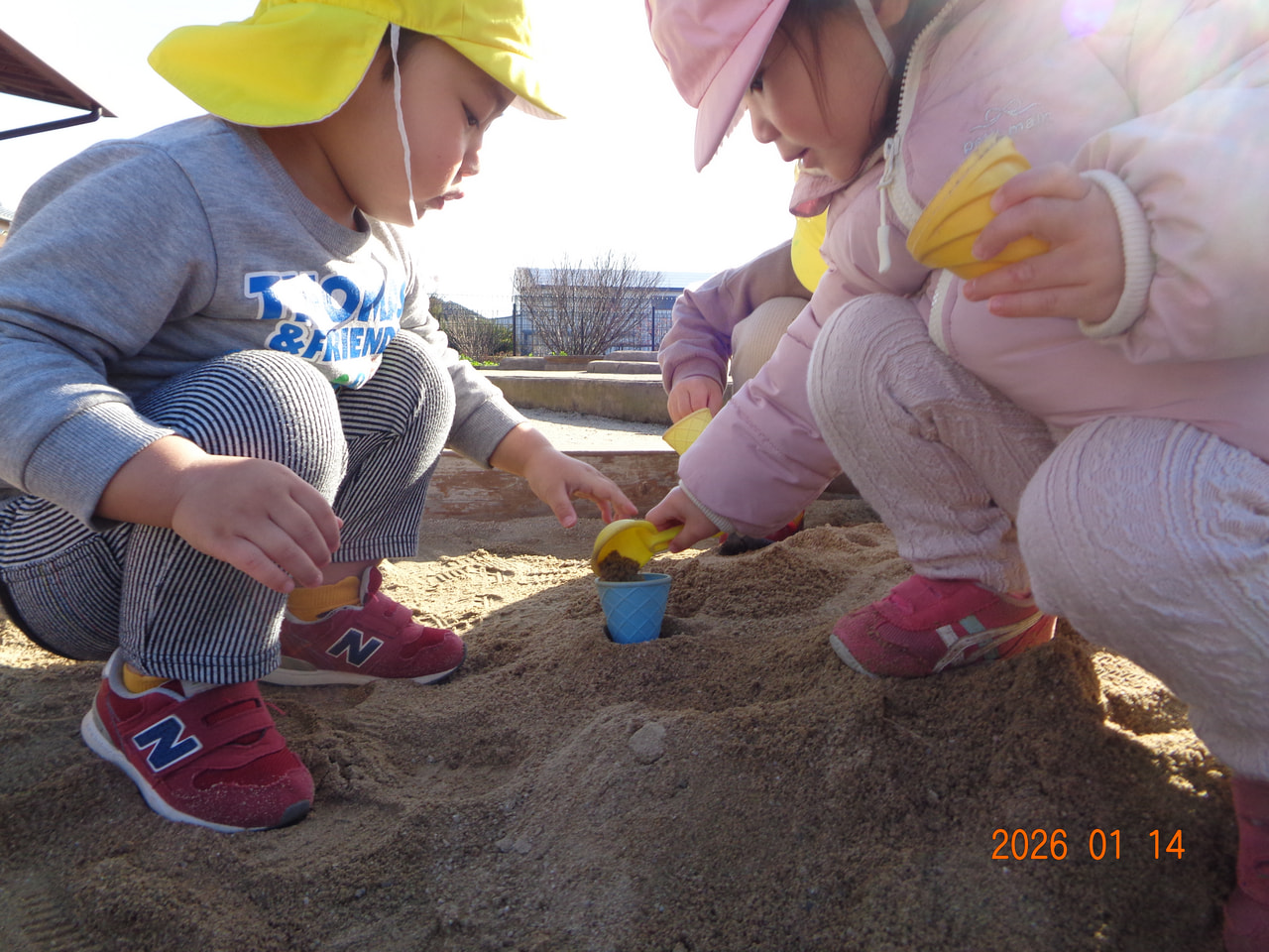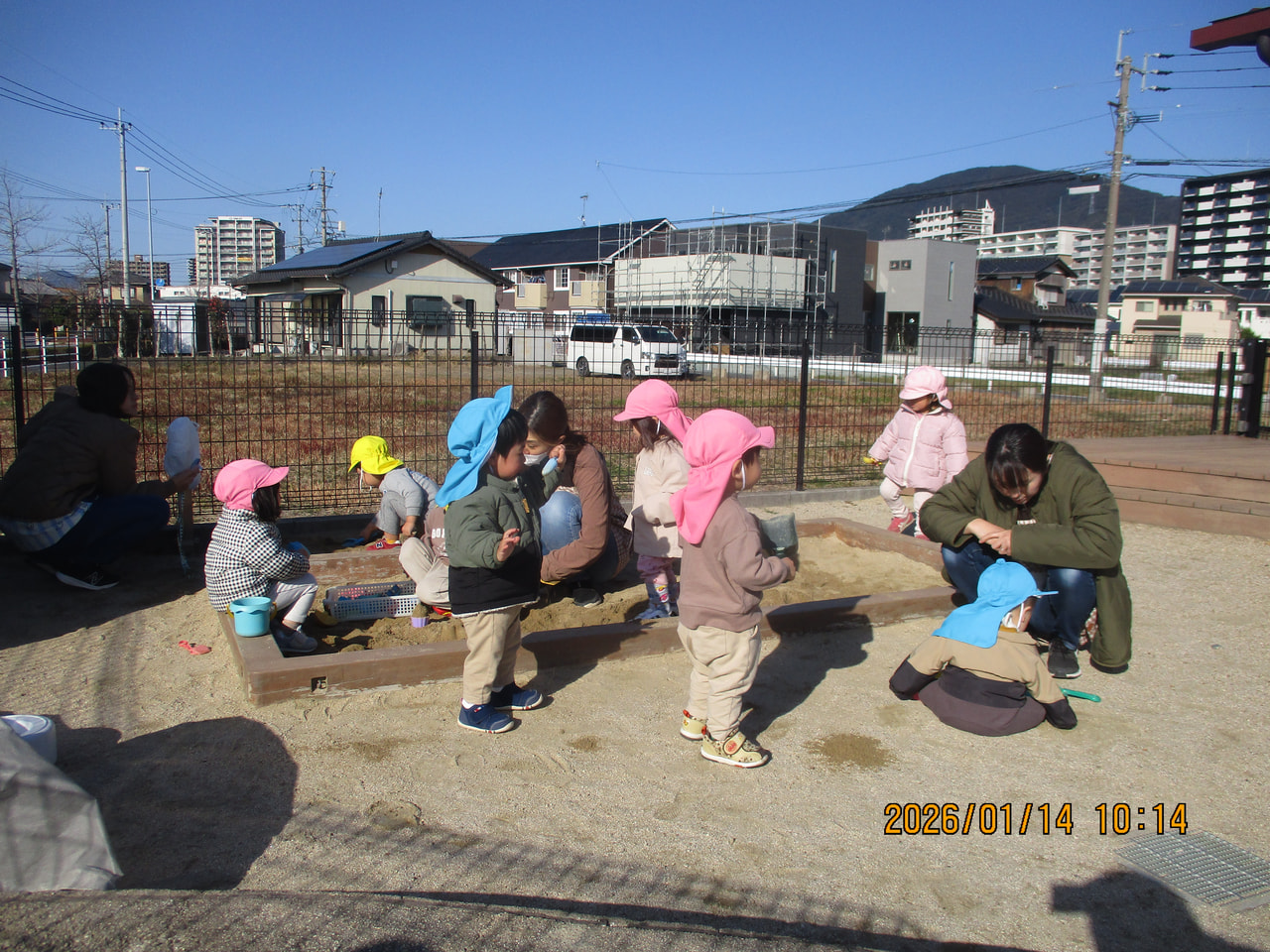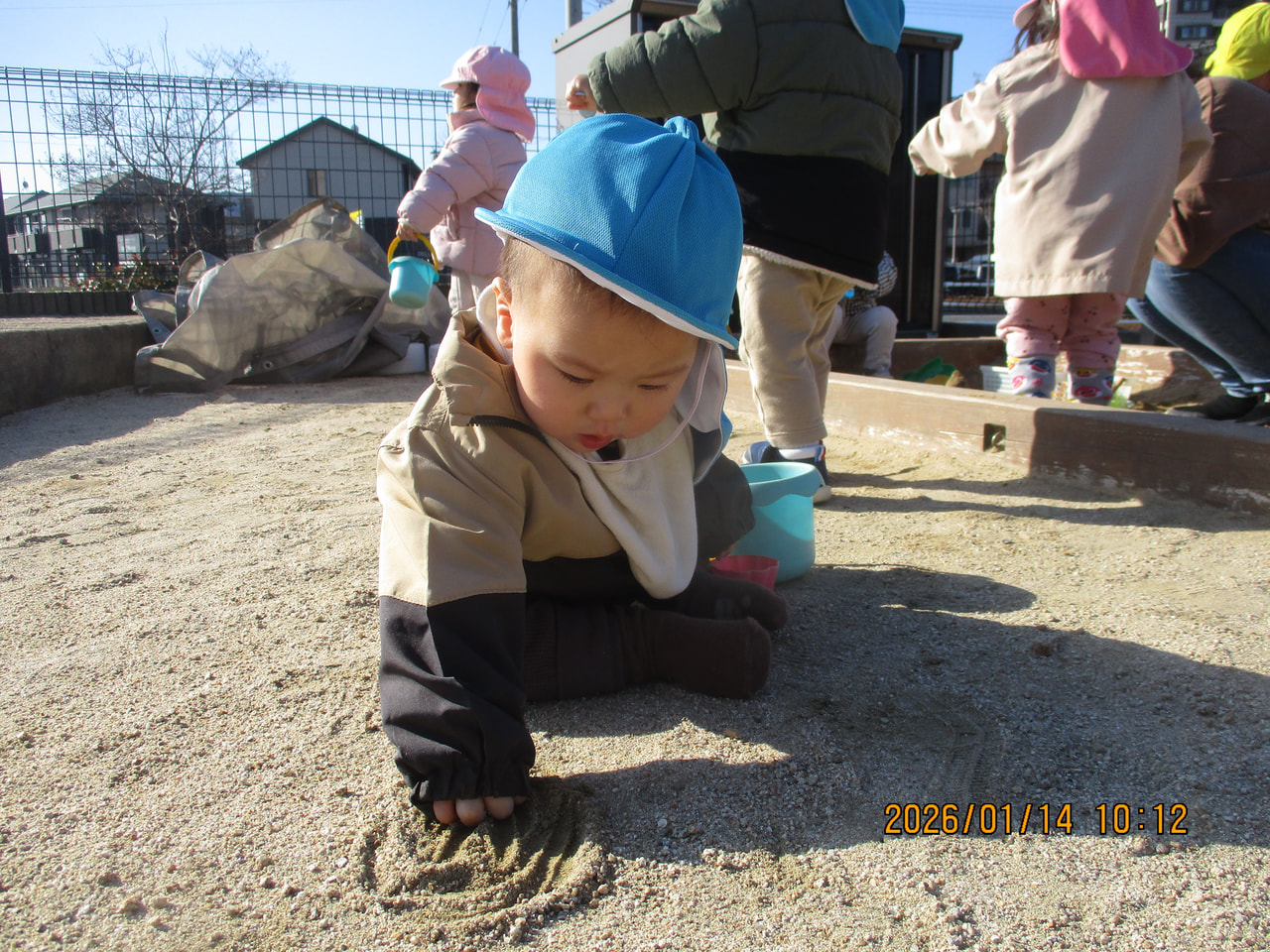 型はめを楽しむ姿やお砂で色々なものを作って遊びました(*^^*)