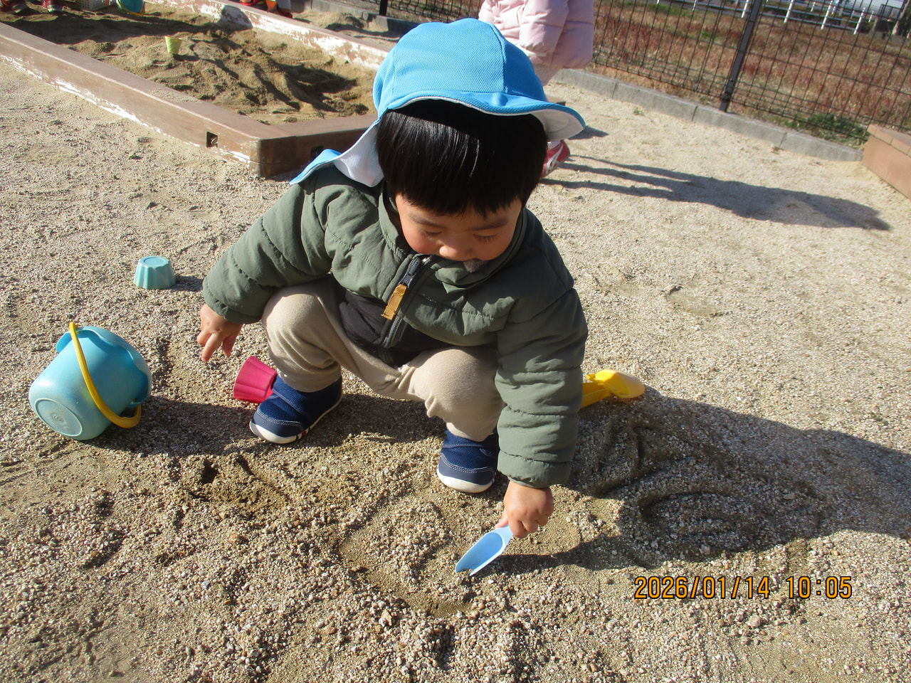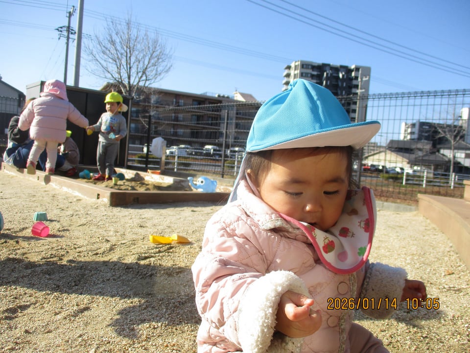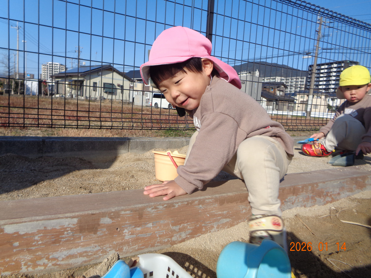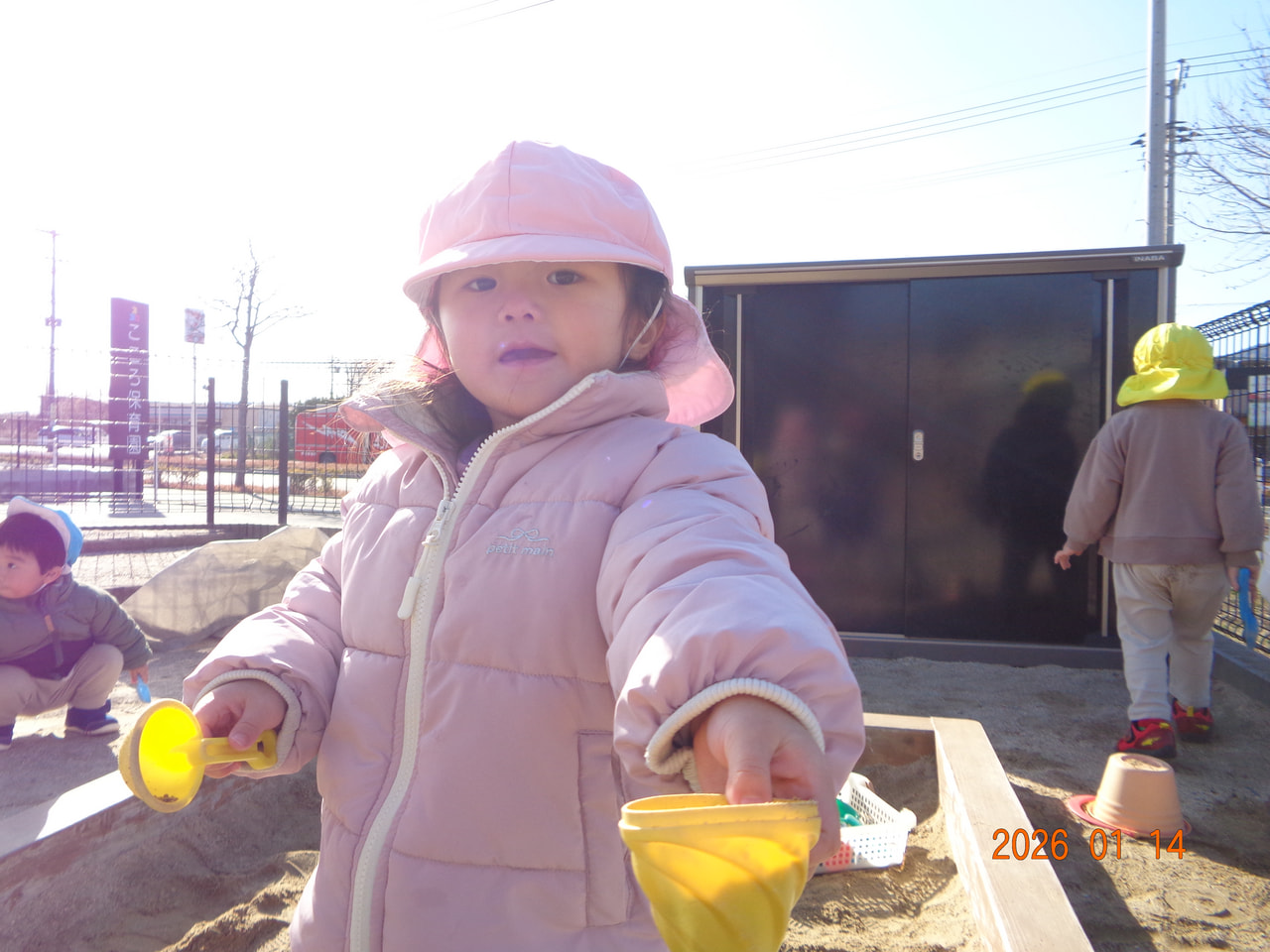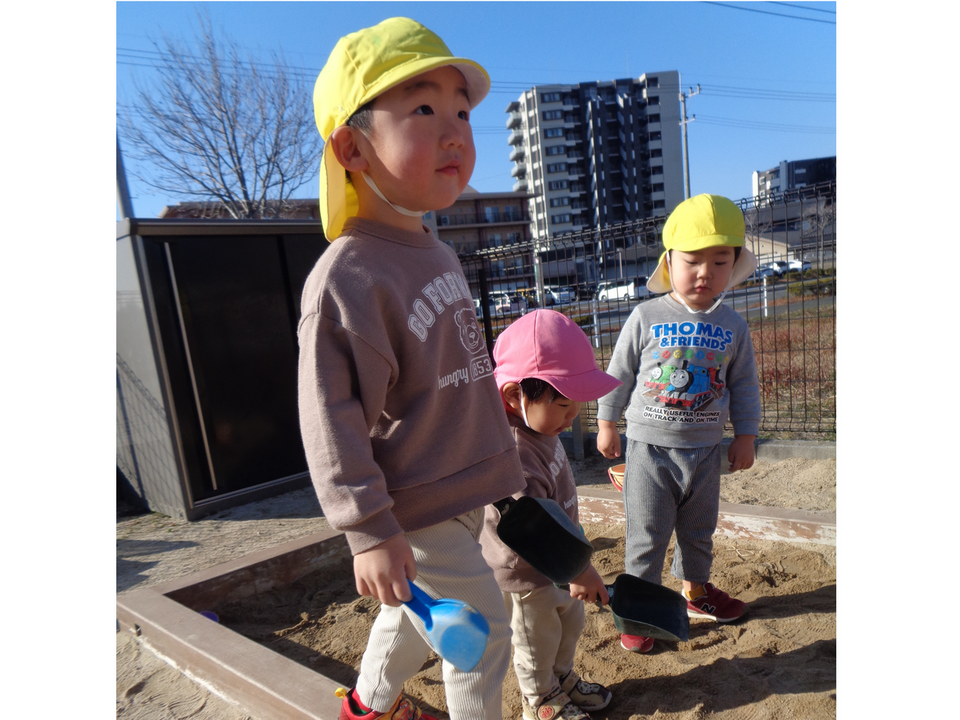 型はめを楽しむ姿やお砂で色々なものを作って遊びました(*^^*)