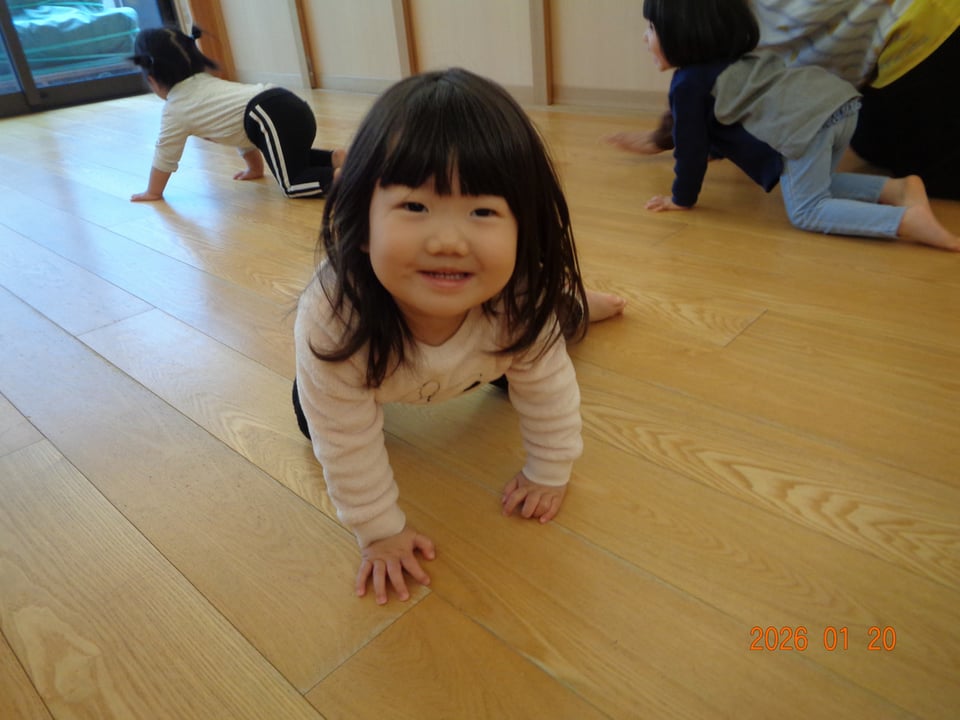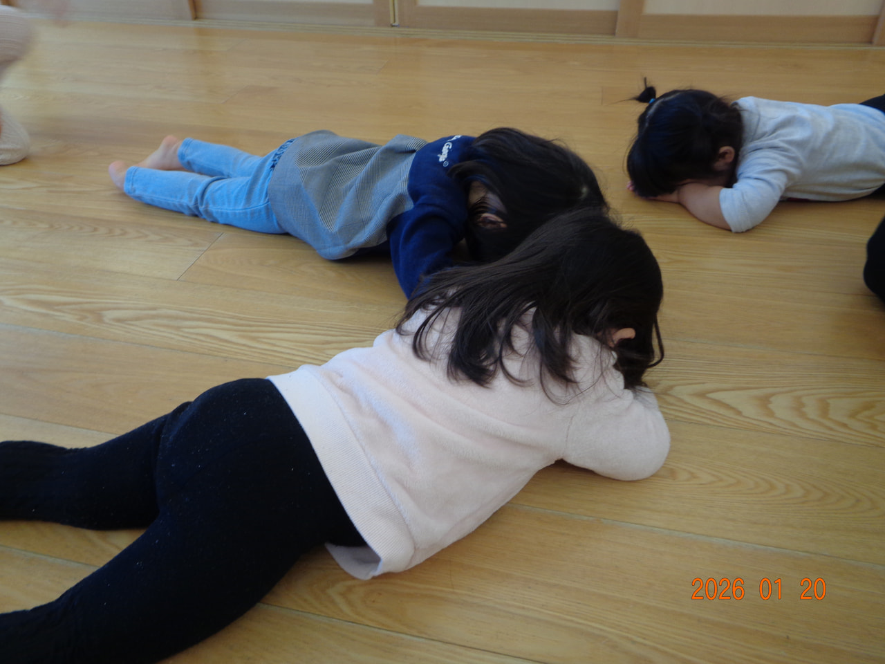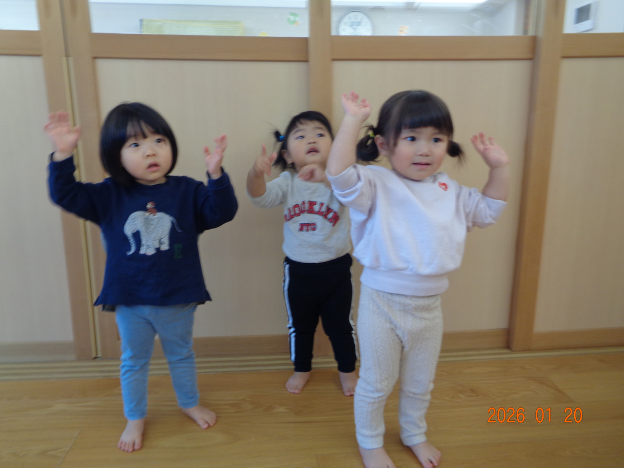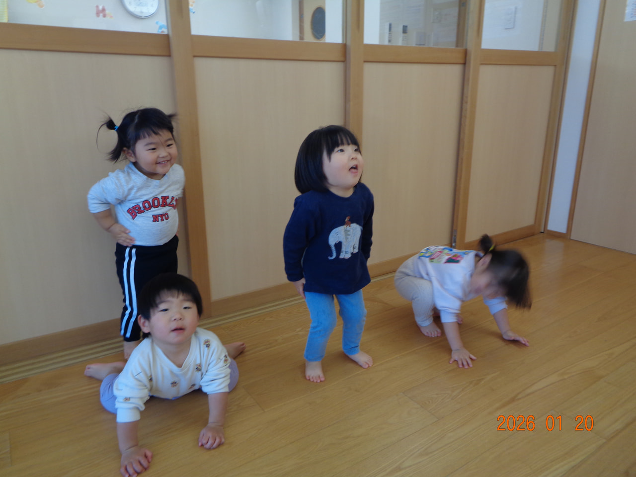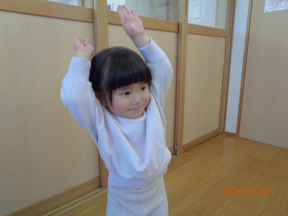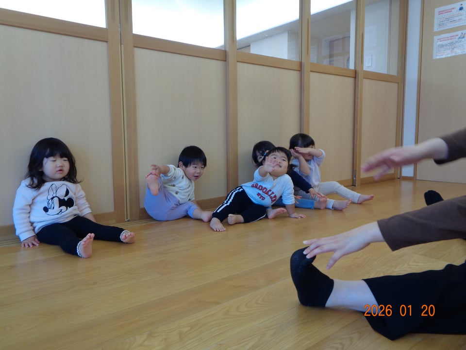 ストレッチやジャンプなど保育士の動きを真似して体を動かす姿が