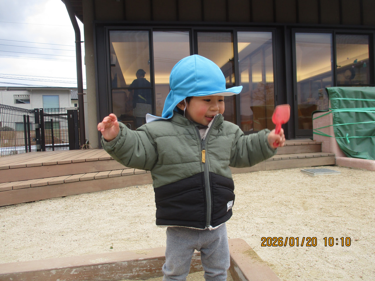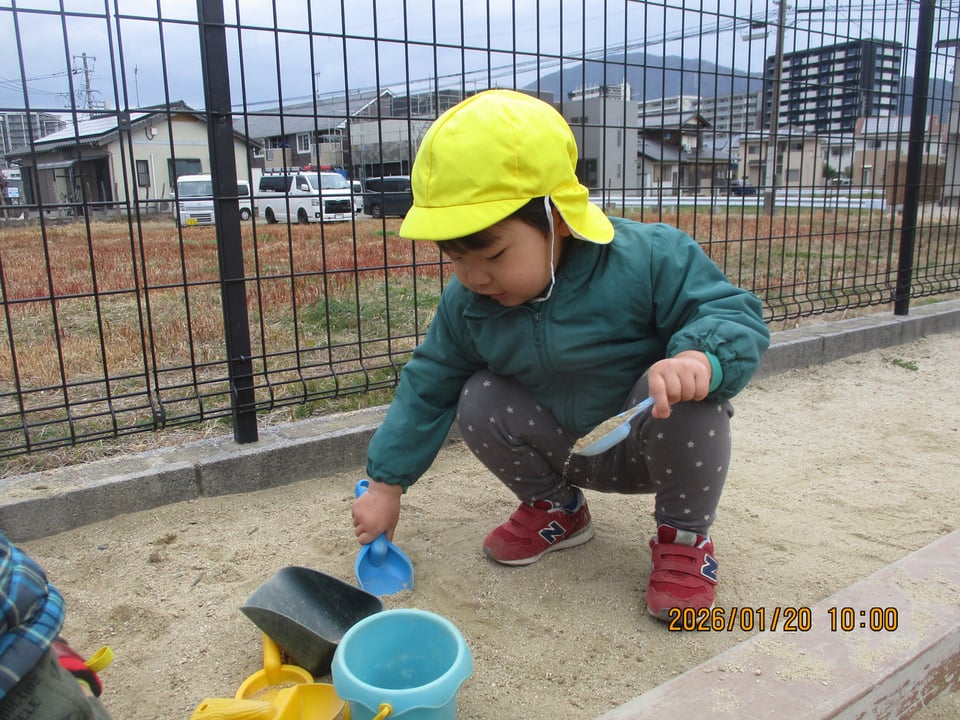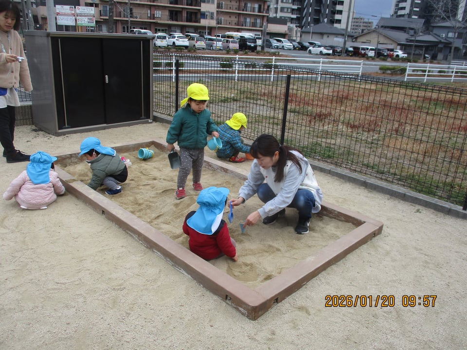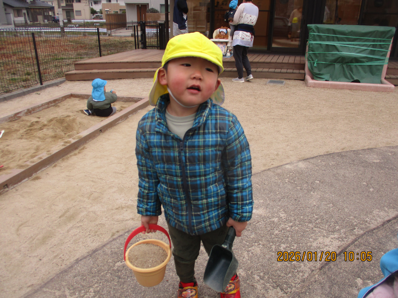 園庭を探索するお友だちや砂の感触を楽しんで遊ぶにじぐみさん😊💕