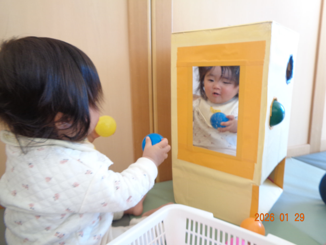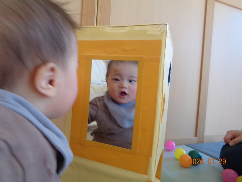 鏡に映る自分に手を伸ばす姿や動く姿を観察して