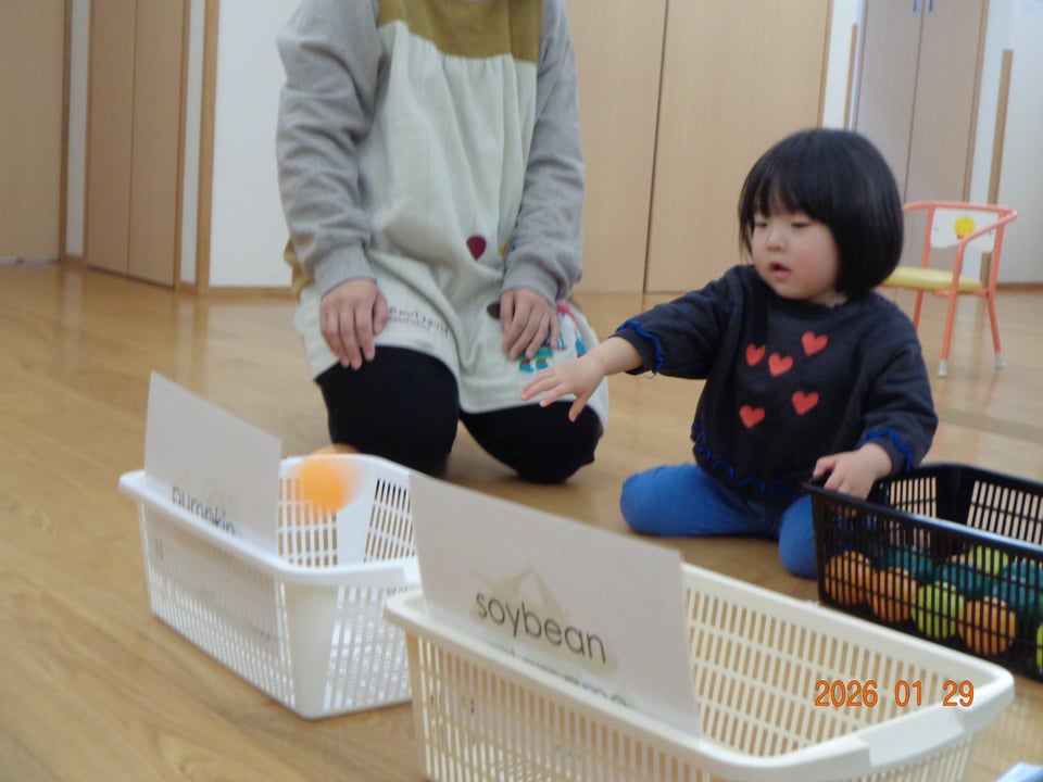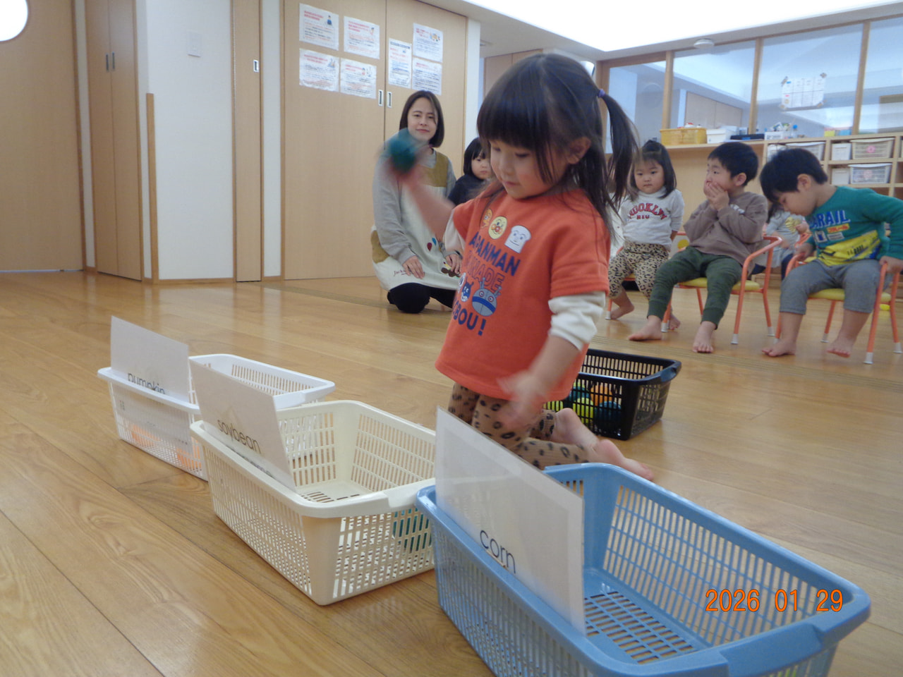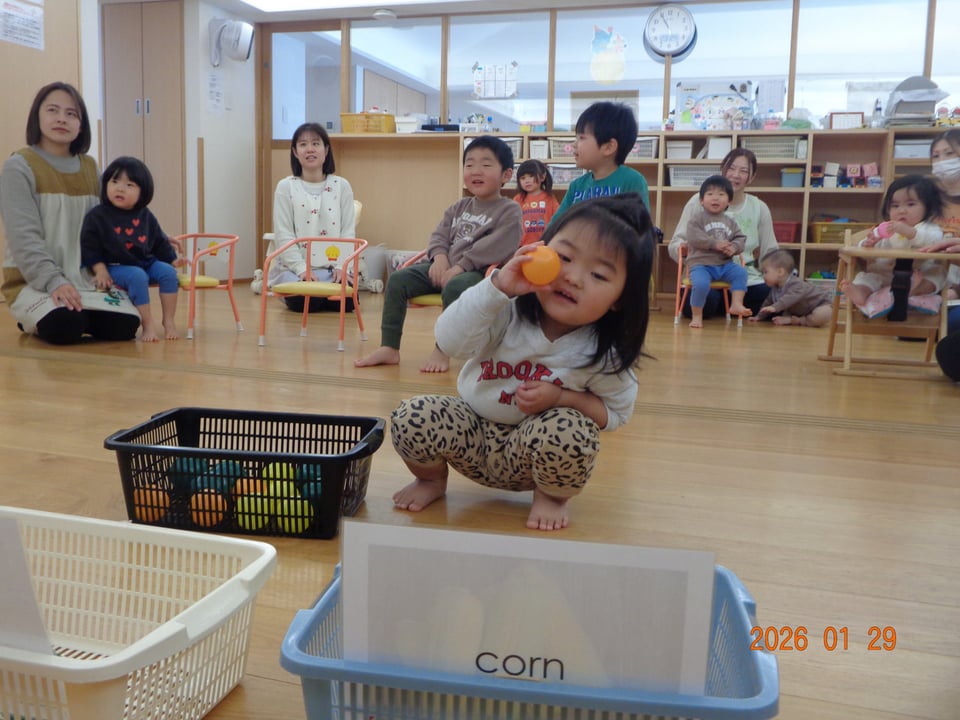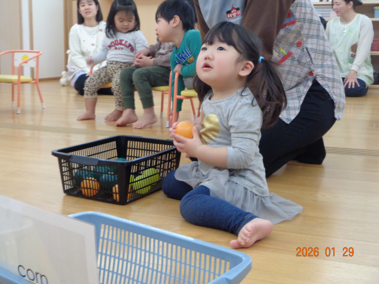 オレンジ・黄色・緑のボールを野菜に見立て、