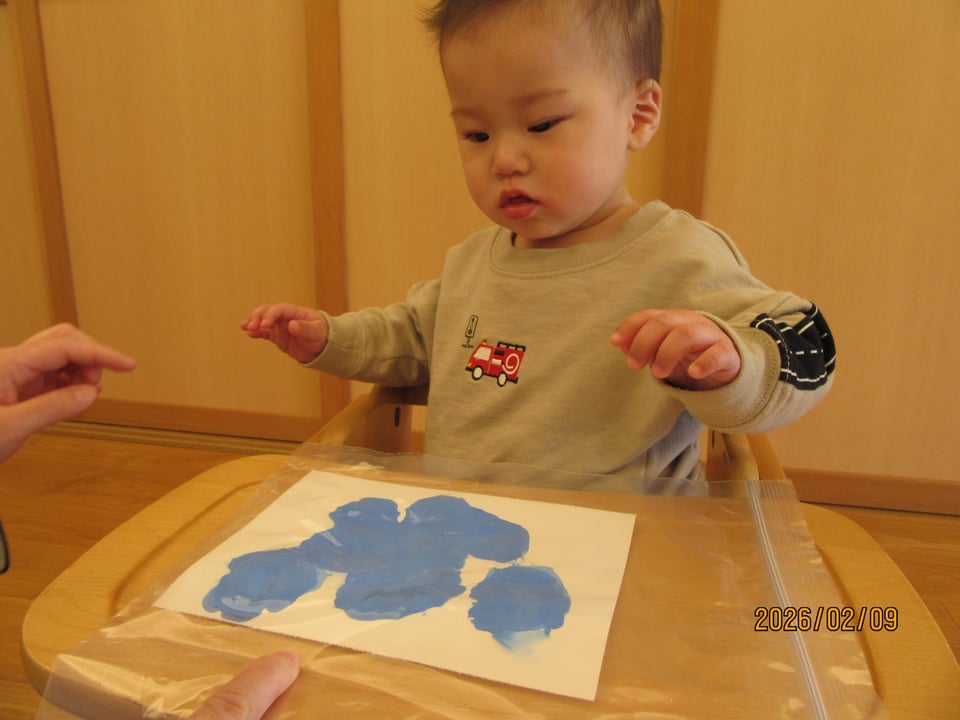 お手てや筆を使って画用紙に絵の具を塗り、