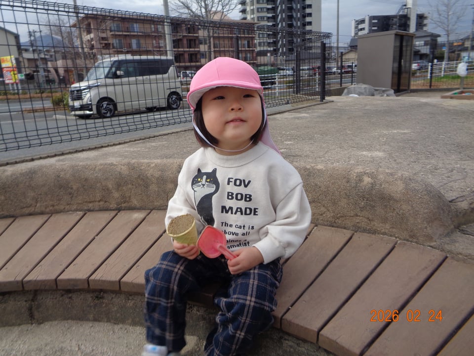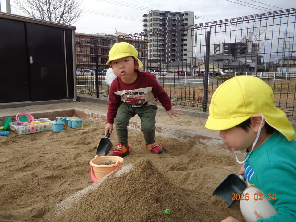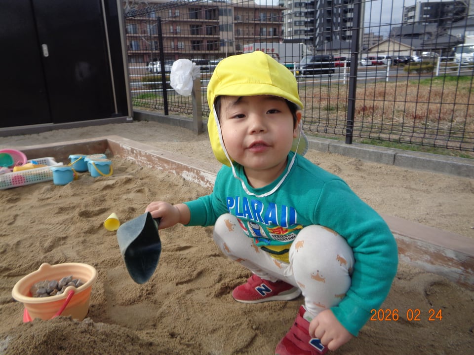 砂場で大きなお山を作り「ここ、おおきいみちができるよ❕」