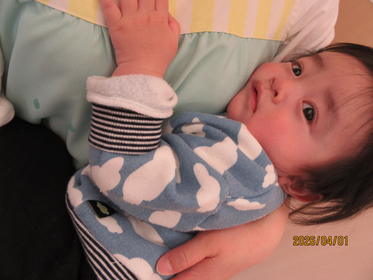 寝返りをしそうな体勢や触れ合い遊びをするとにっこりと笑い