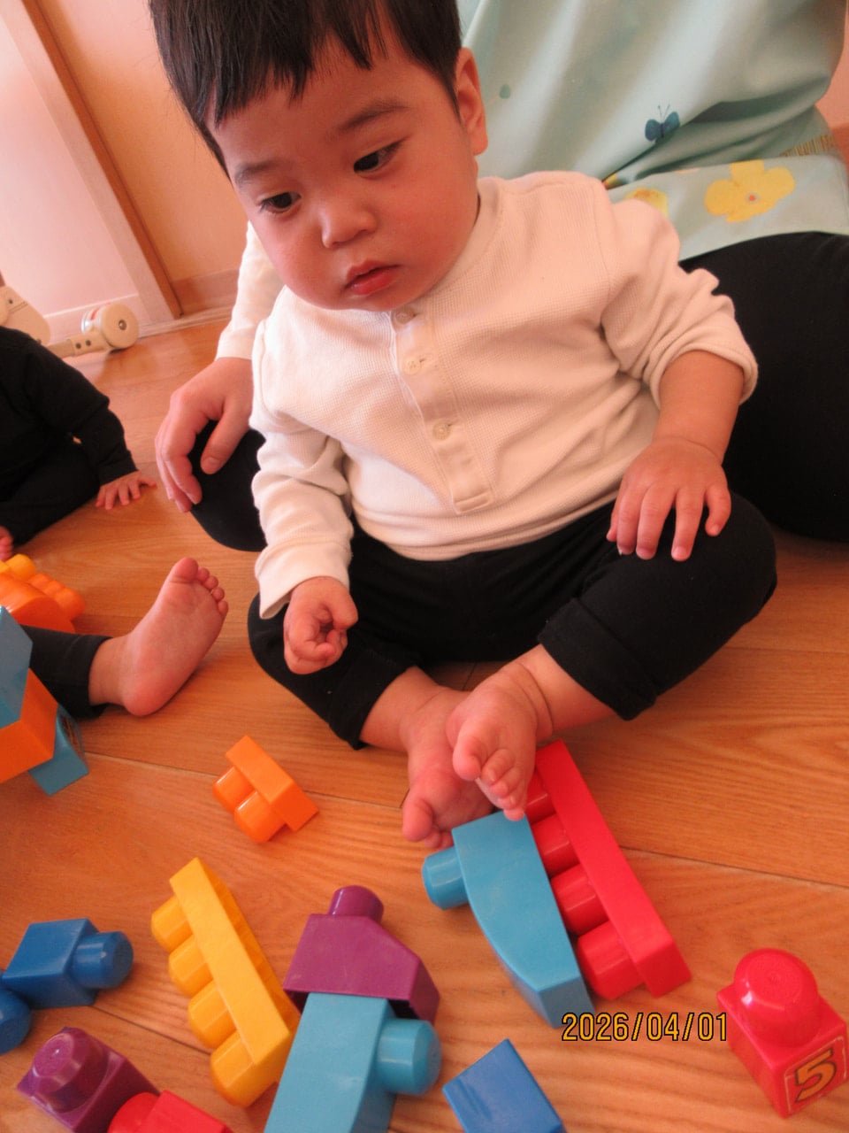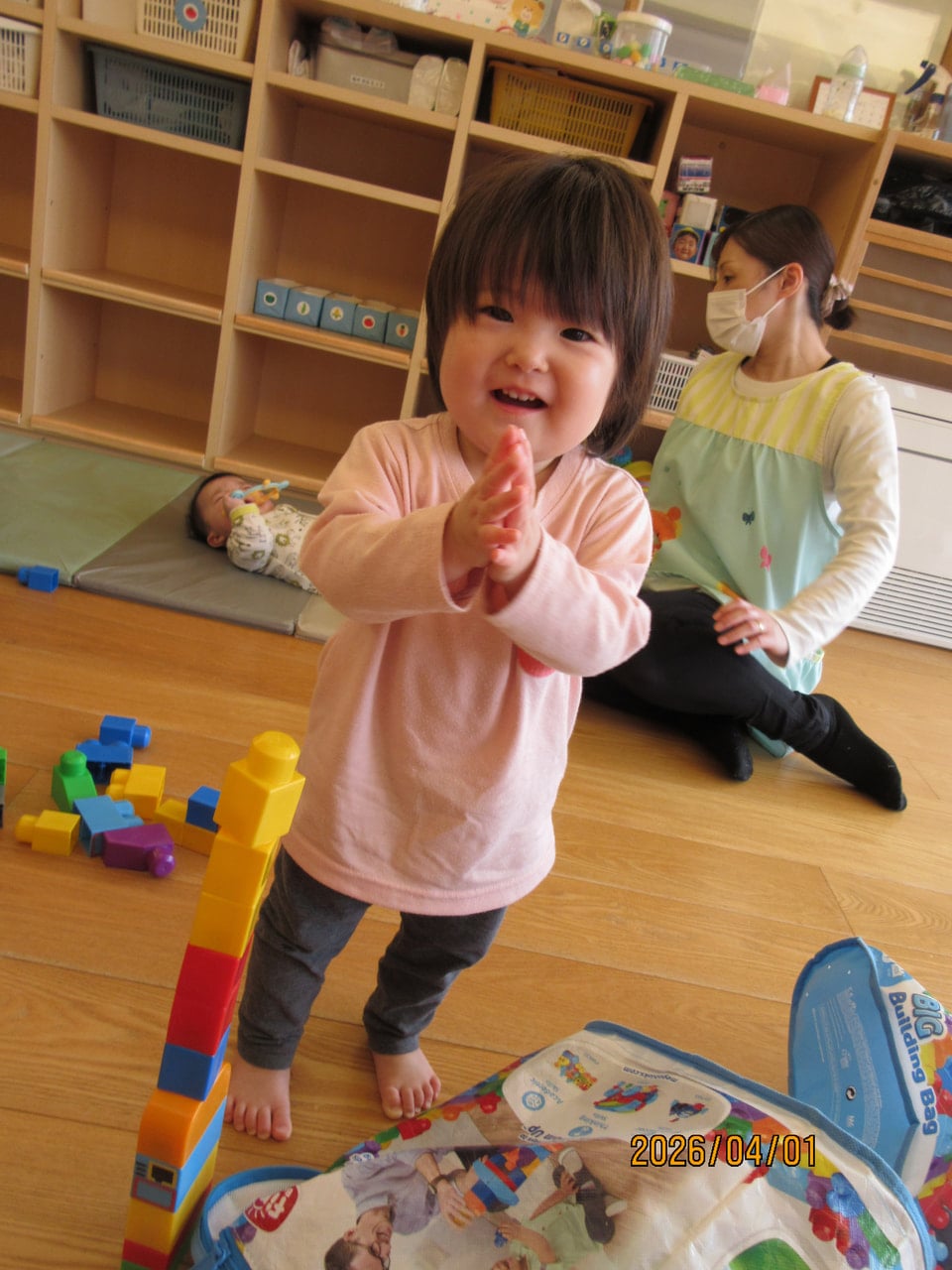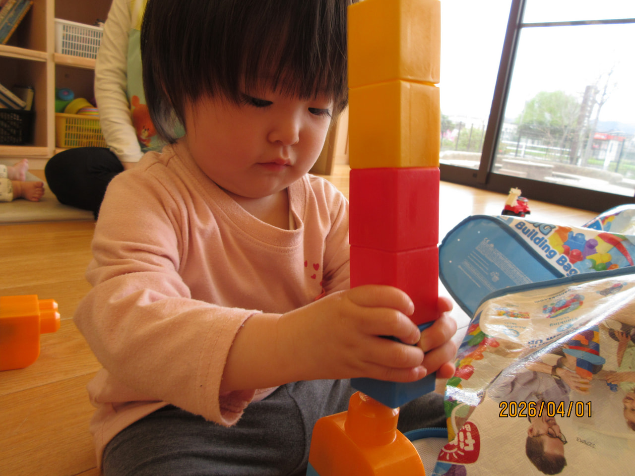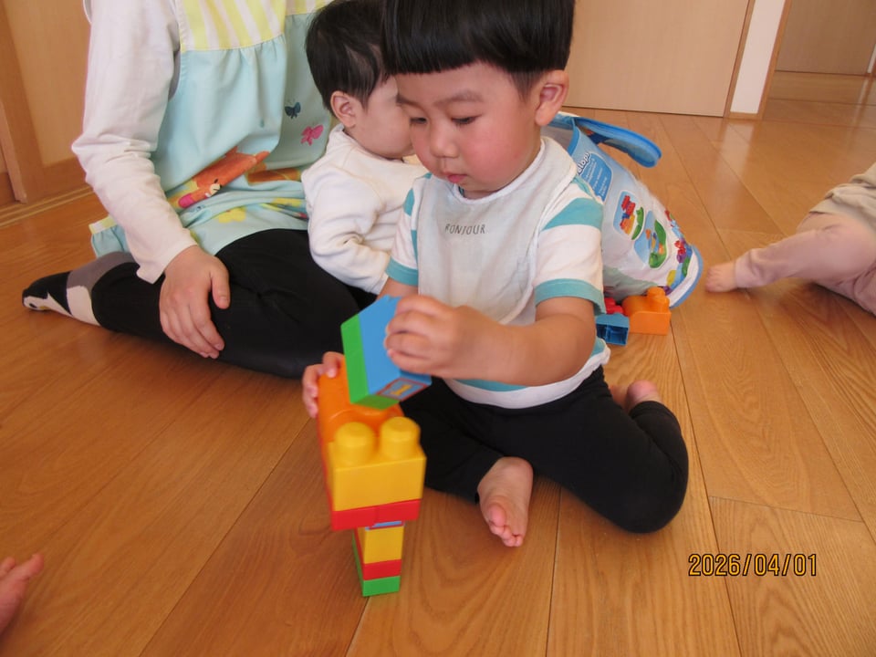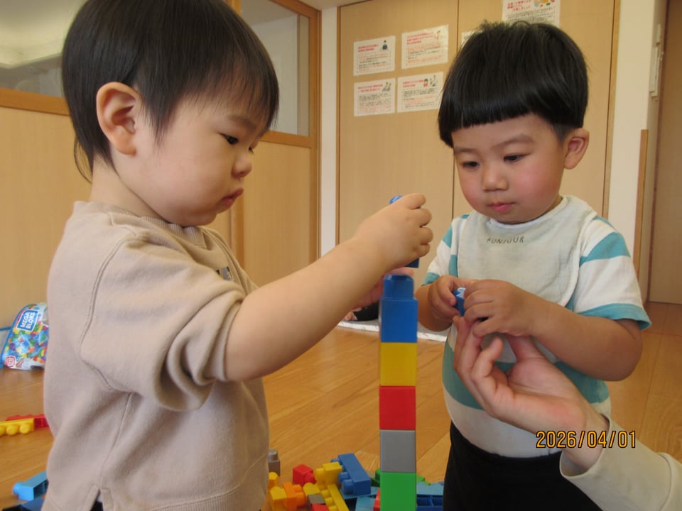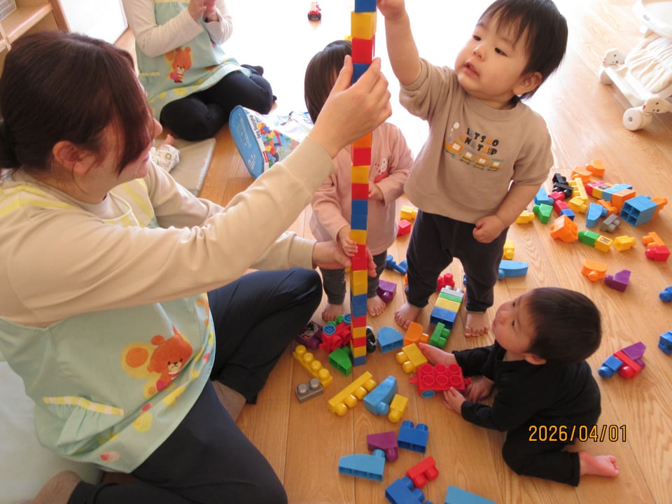 一生懸命な様子、高く積み上げて保育士と一緒に楽しむ姿が
