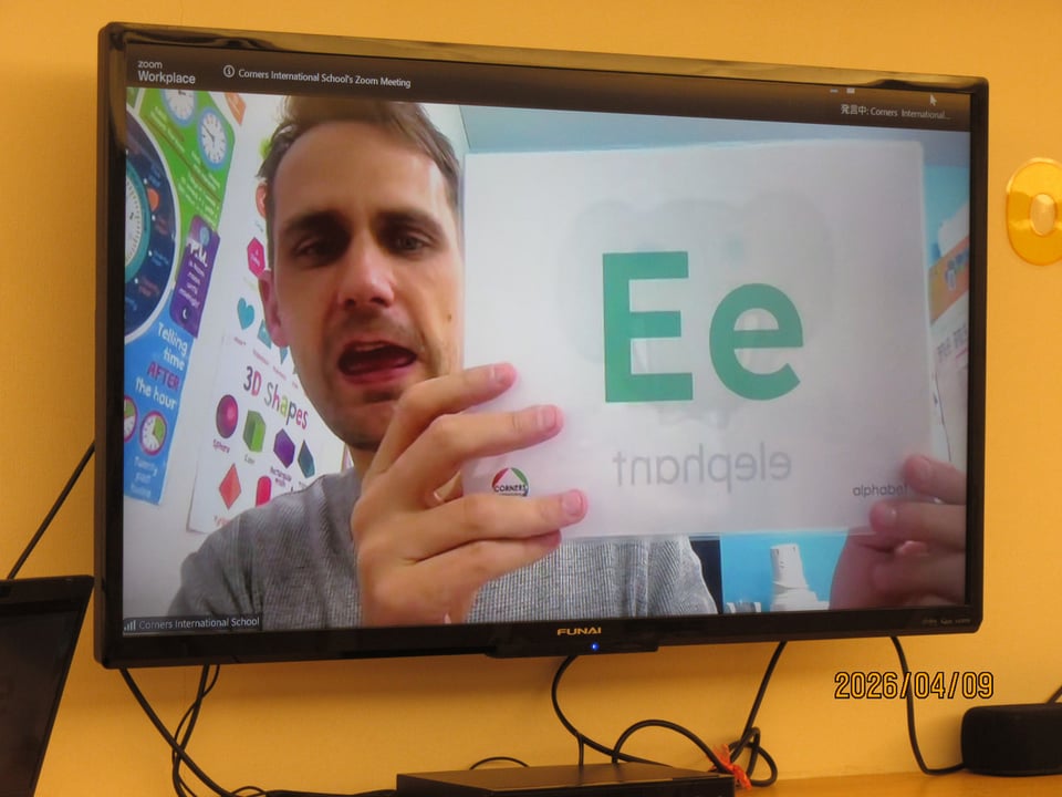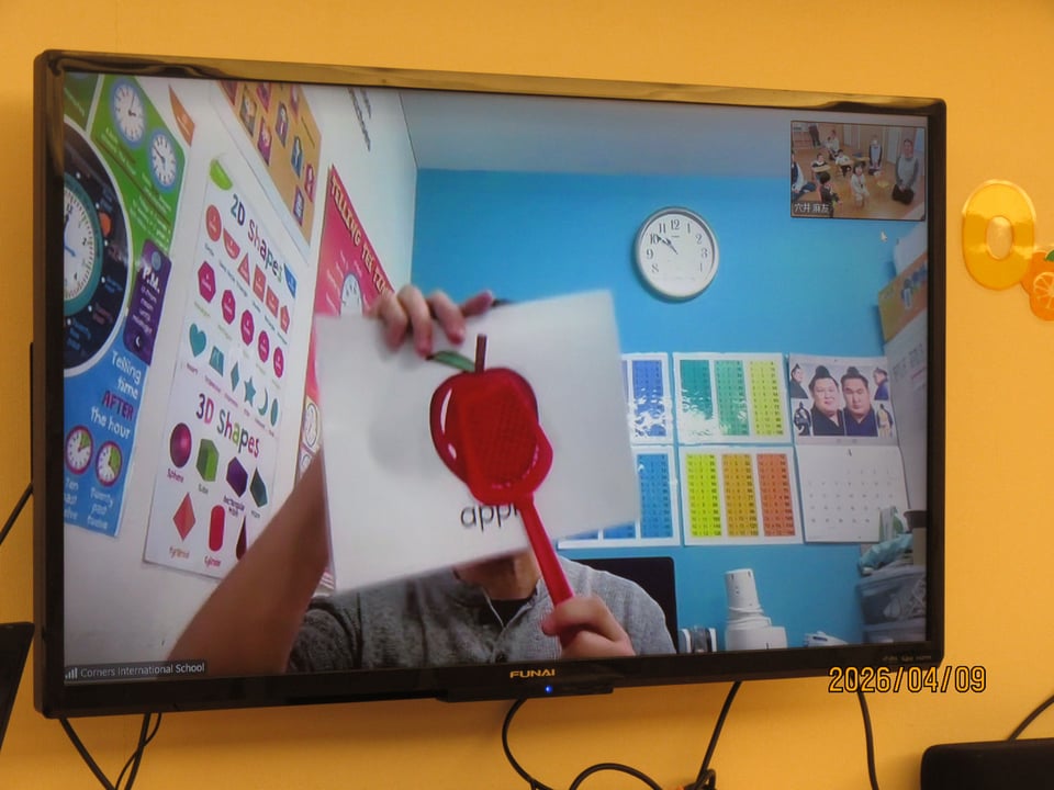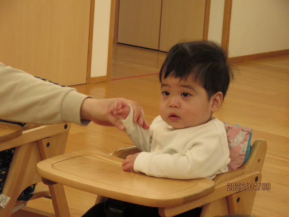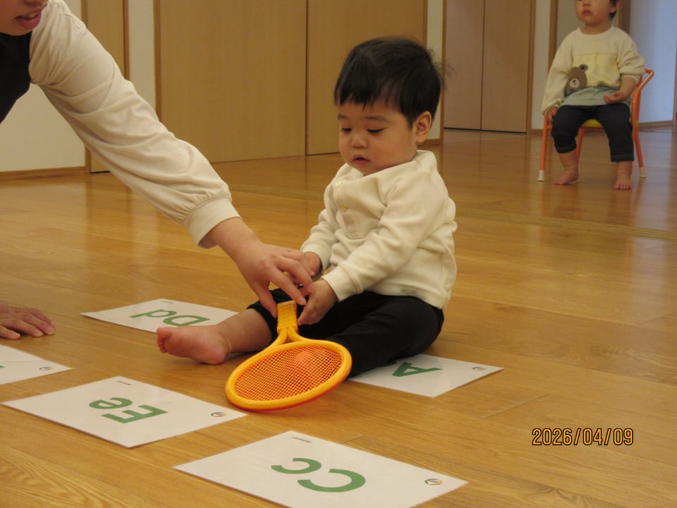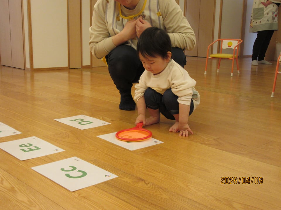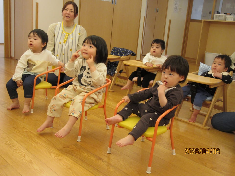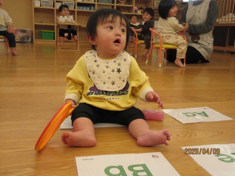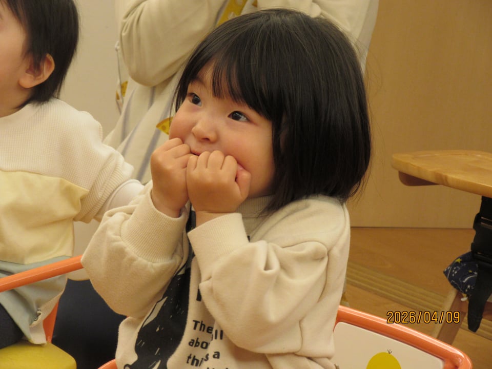お名前を呼ばれると保育士と一緒に「 I'm here ✋」