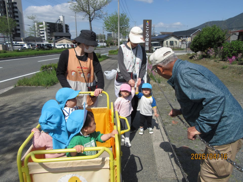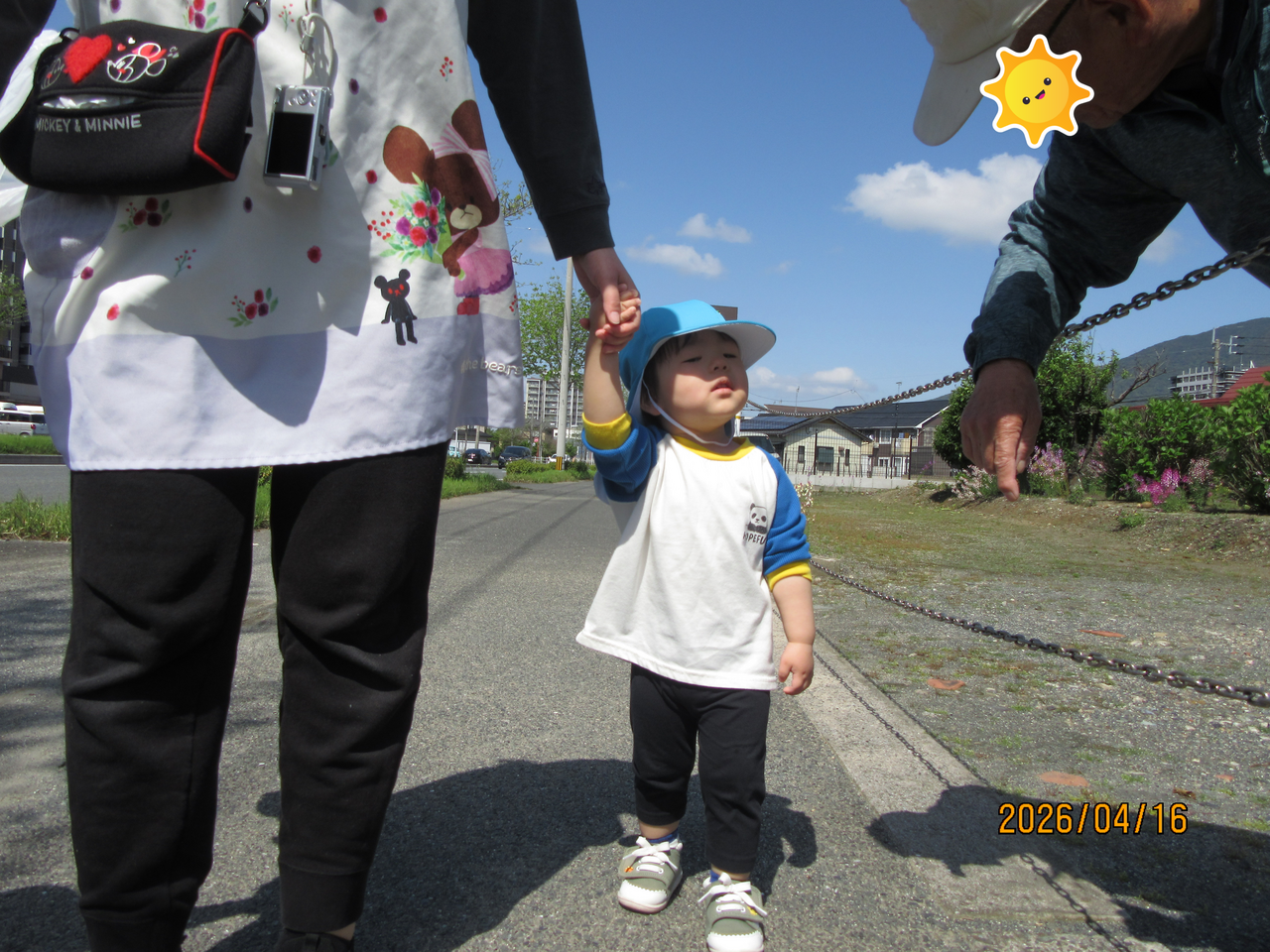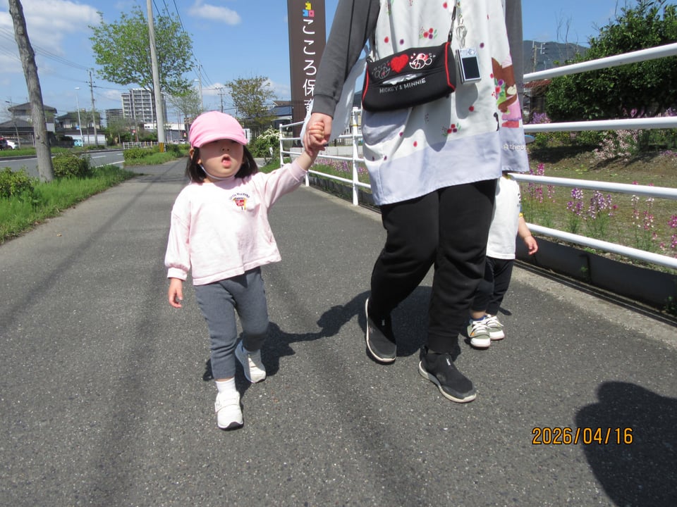 ほしぐみさんとそらぐみさんは、保育士と手を繋いで歩くお友だちや
