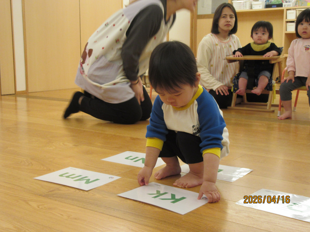 講師が子どもたち伝えるアルファベットをよく聞いて