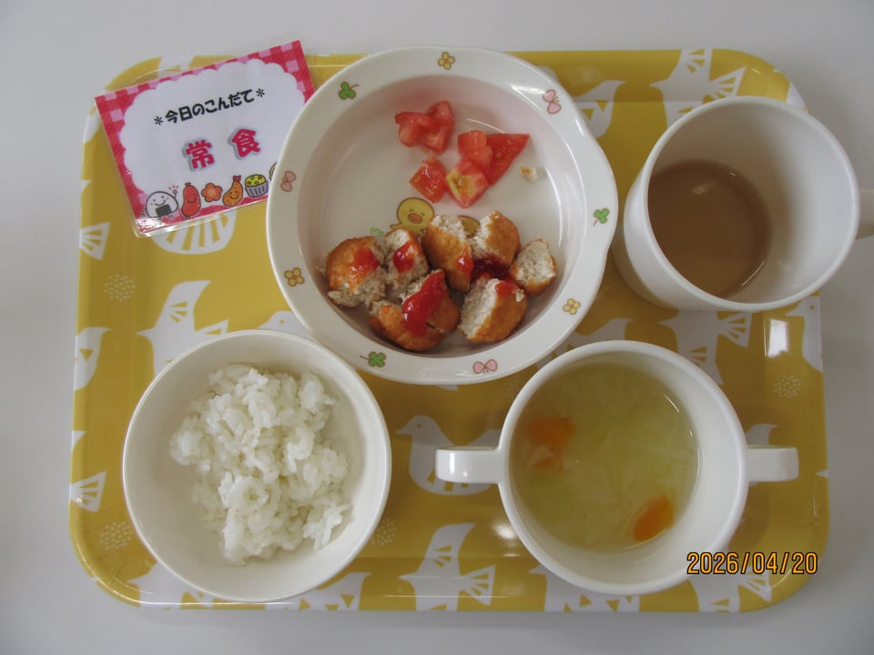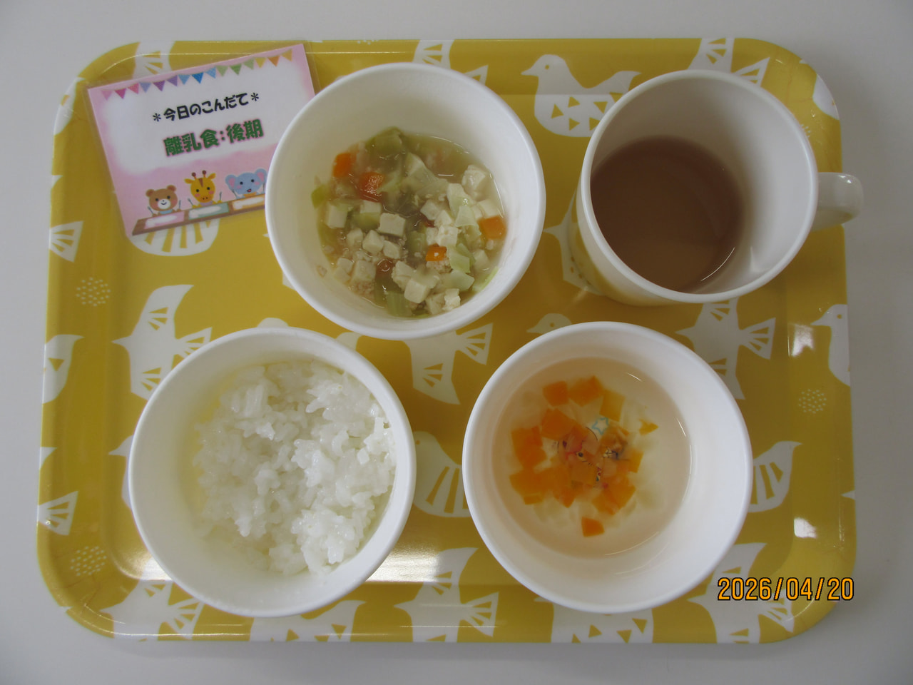 ・軟飯 ・キャベツのそぼろ煮 ・野菜スープ
